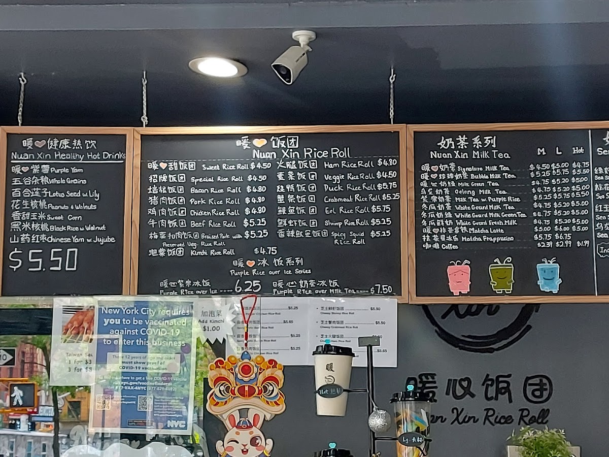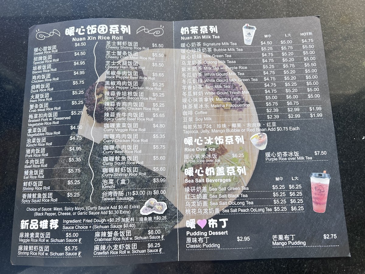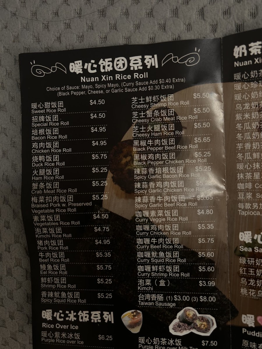 The menu at Nuan Xin Rice Roll offers a selection of simple, comforting Taiwanese bites centered around their signature rice rolls. These handheld delights combine soft, warm rice with various fillings like braised pork, chicken, or Taiwan sausage, offering a gentle balance of savory and subtly sweet flavors. Alongside these, a variety of cozy drinks such as taro milk tea, peach tea with salted cheese foam, and classic bubble milk tea complement the food perfectly.