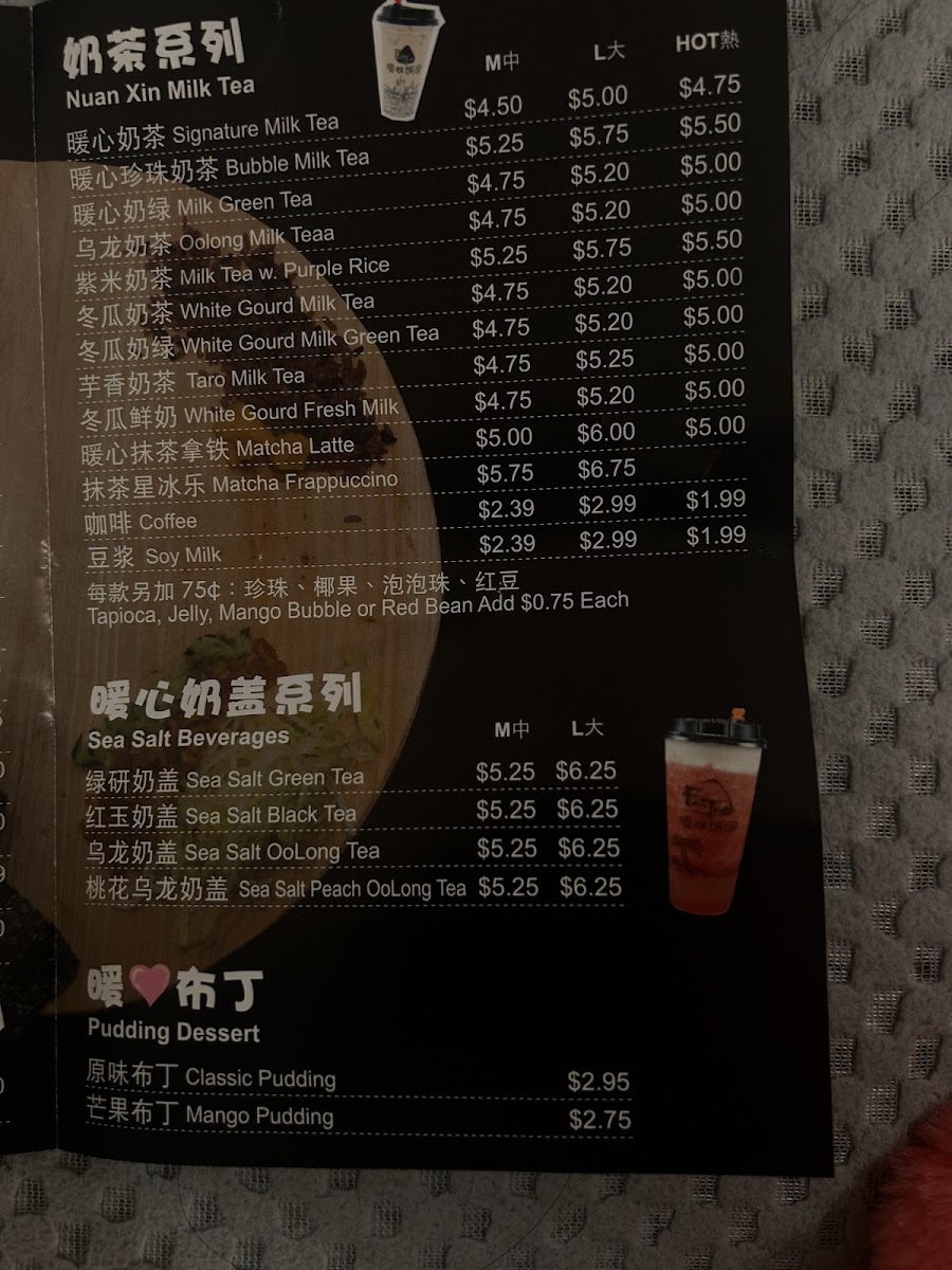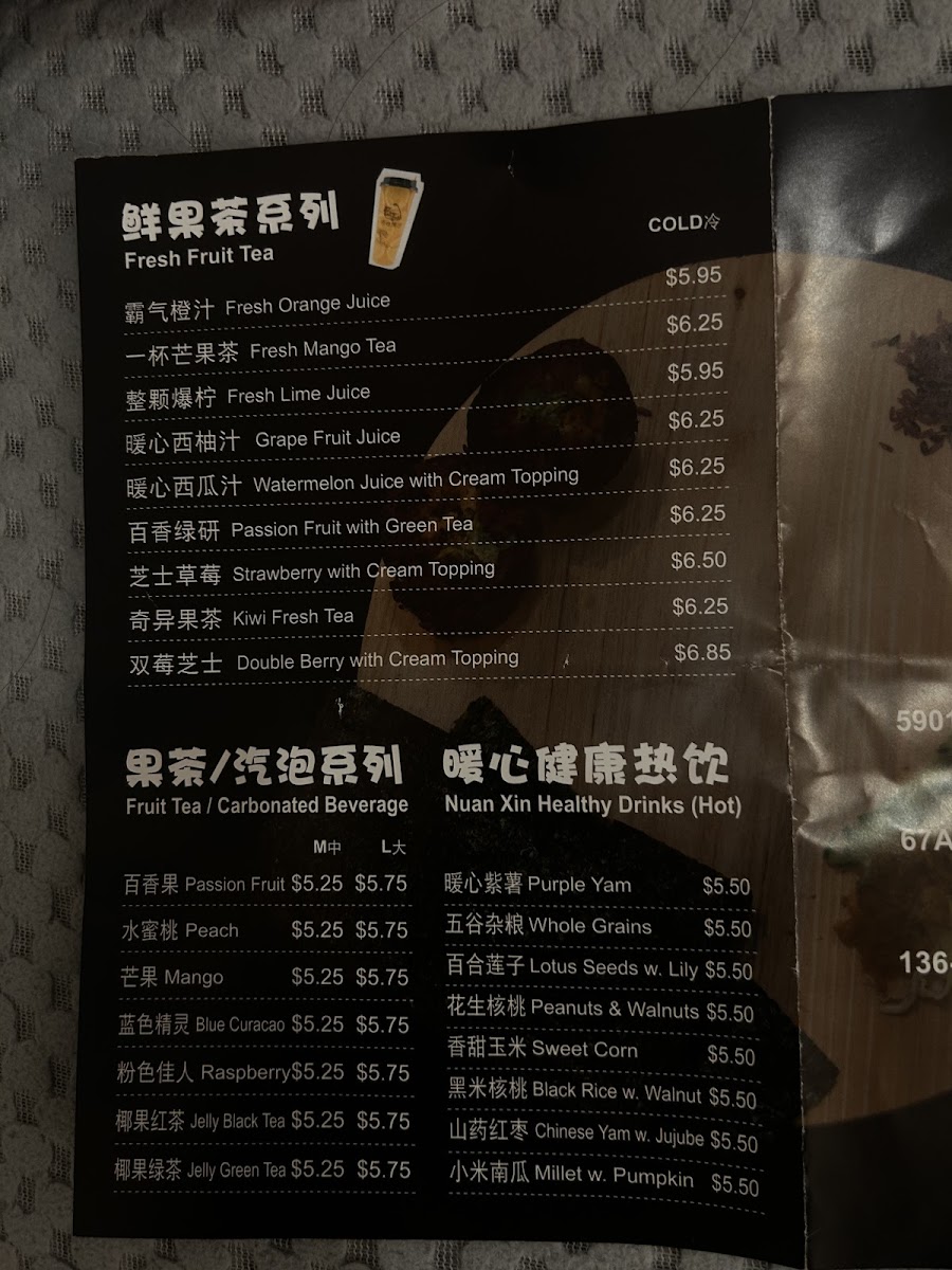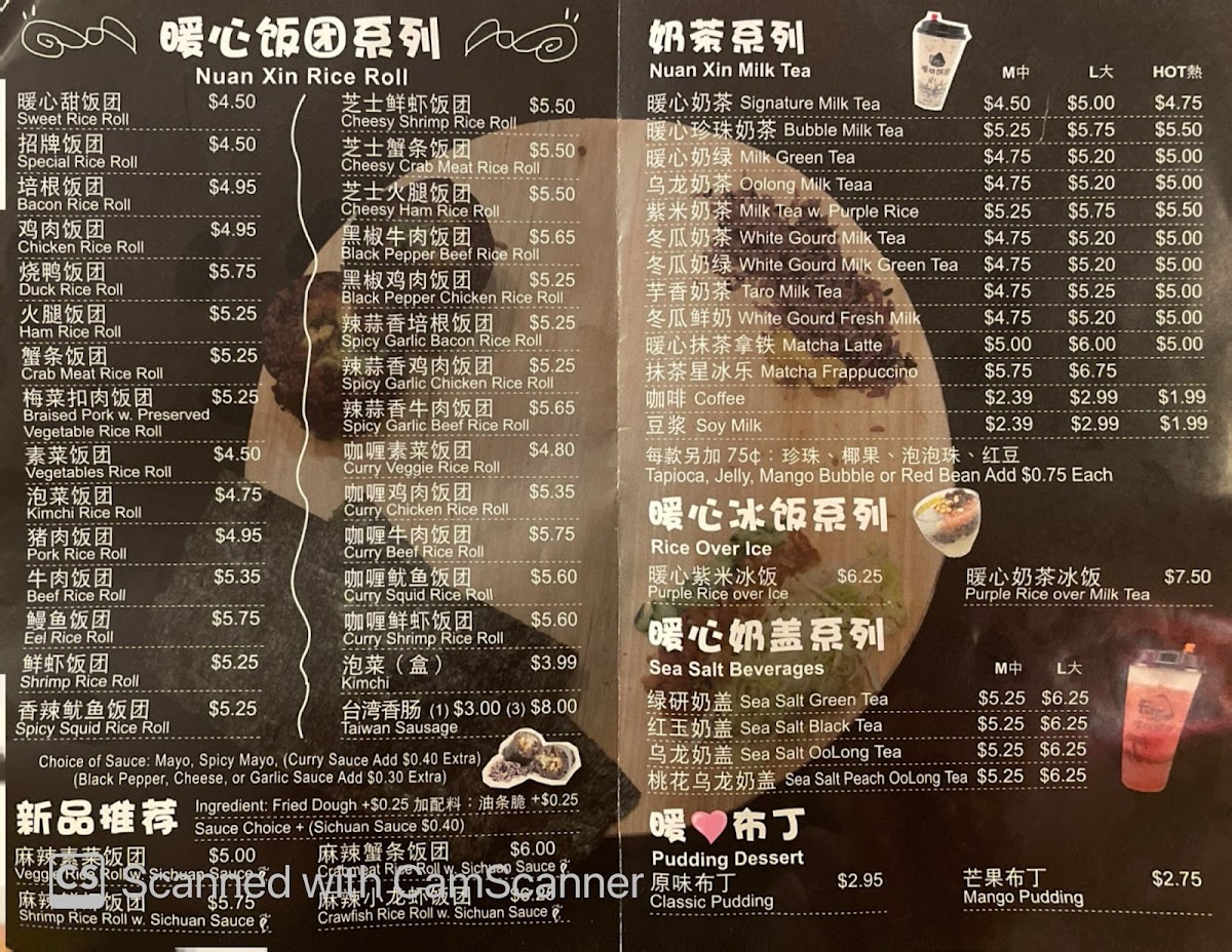The menu at Nuan Xin Rice Roll offers a selection of simple, comforting Taiwanese bites centered around their signature rice rolls. These handheld delights combine soft, warm rice with various fillings like braised pork, chicken, or Taiwan sausage, offering a gentle balance of savory and subtly sweet flavors. Alongside these, a variety of cozy drinks such as taro milk tea, peach tea with salted cheese foam, and classic bubble milk tea complement the food perfectly.